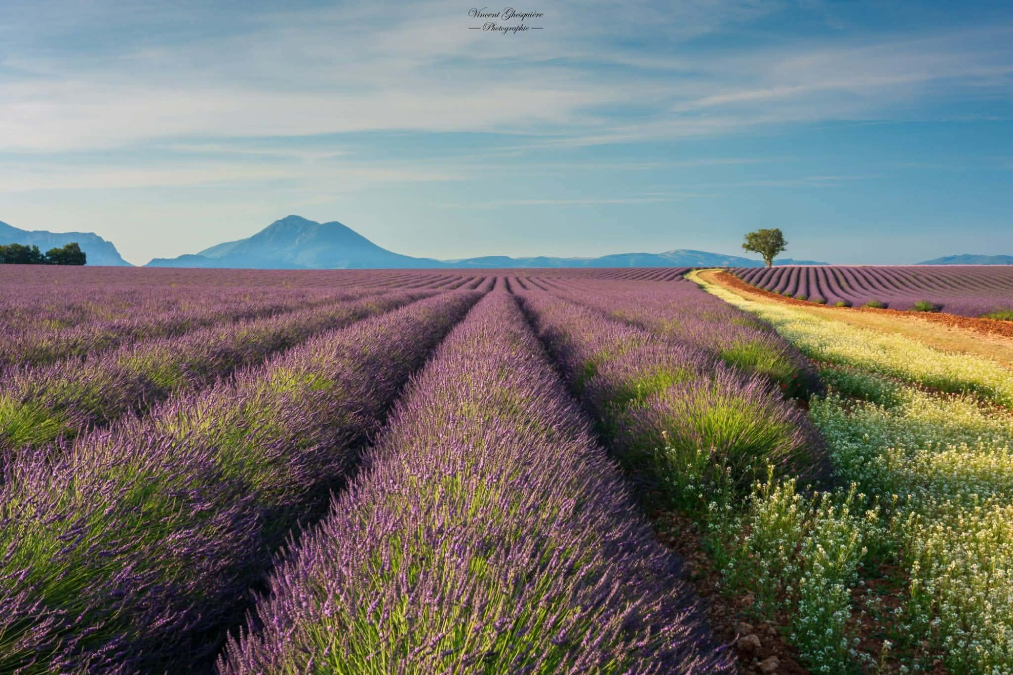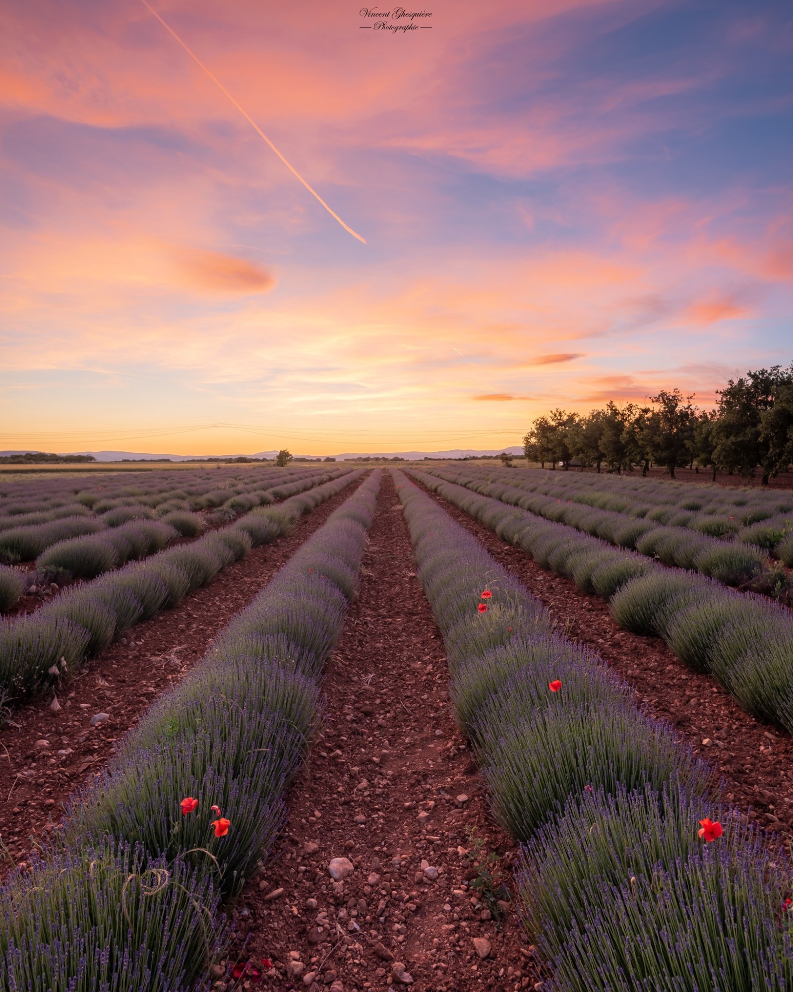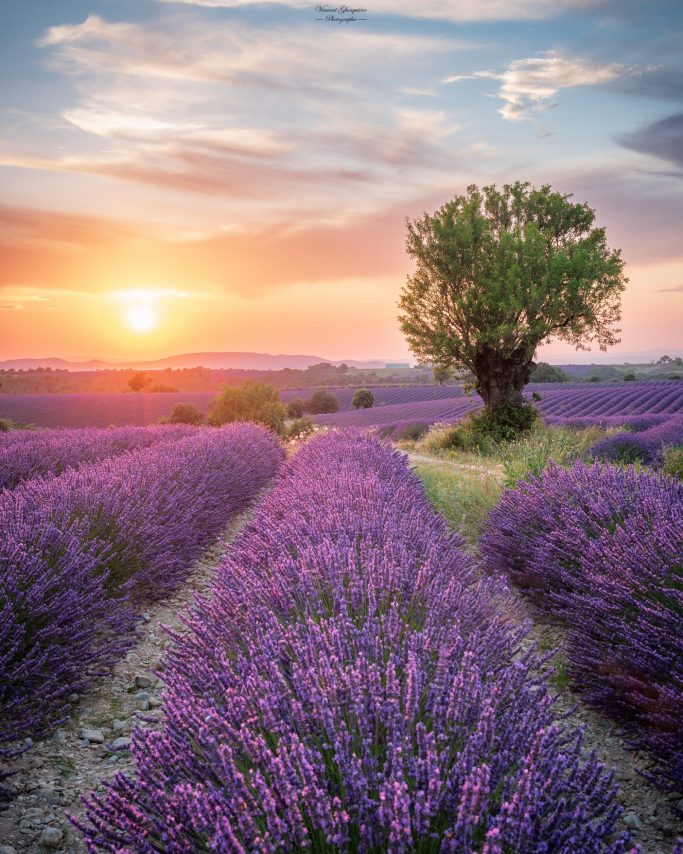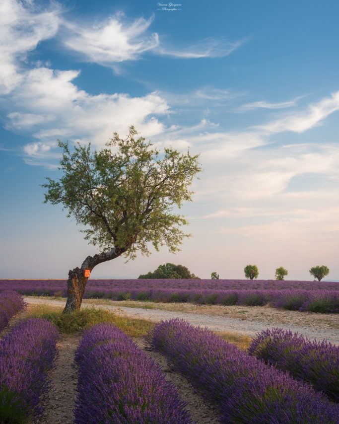Quand les fleurs s'enflamment sous l'étreinte du crépuscule, l'amandier devient le gardien du temps. Plateau de Valensole, 10 juillet 2023.
