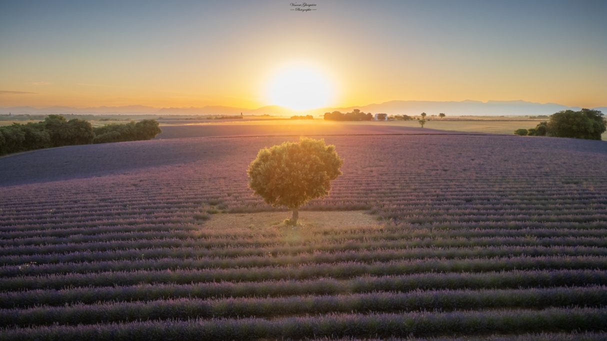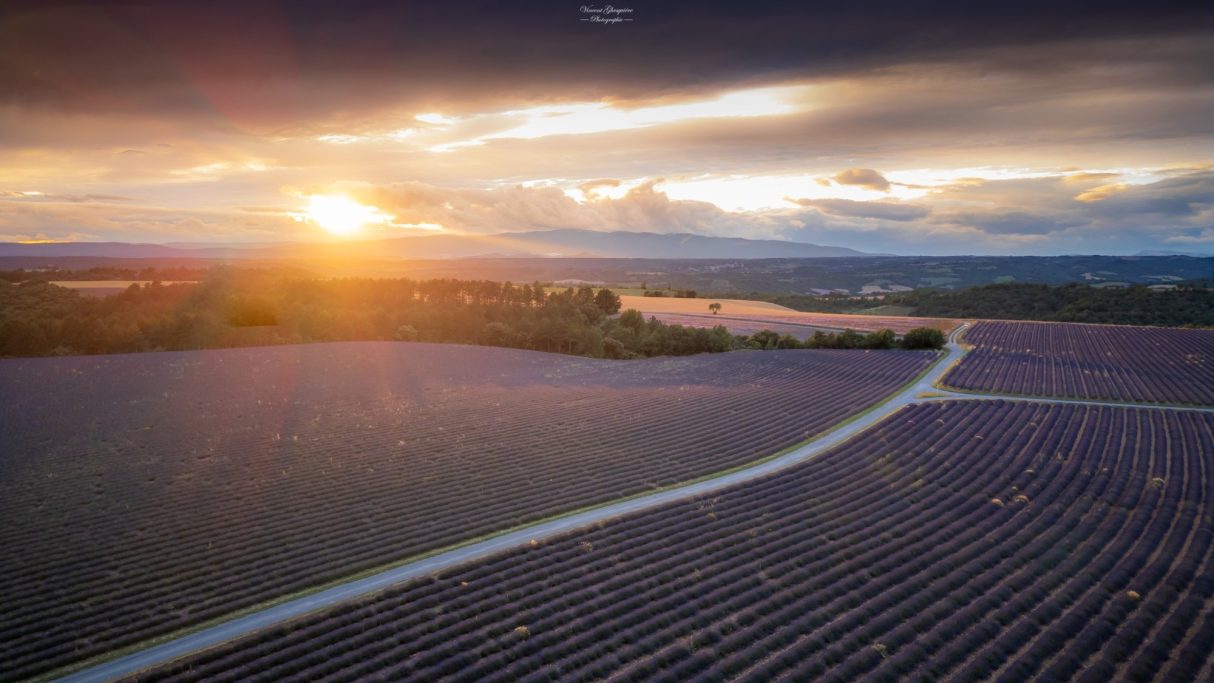 Vue du ciel, la lavande s’étend à l’infini tandis que le soleil s’éteint lentement à l’horizon. Entrevennes, 23 juin 2024.