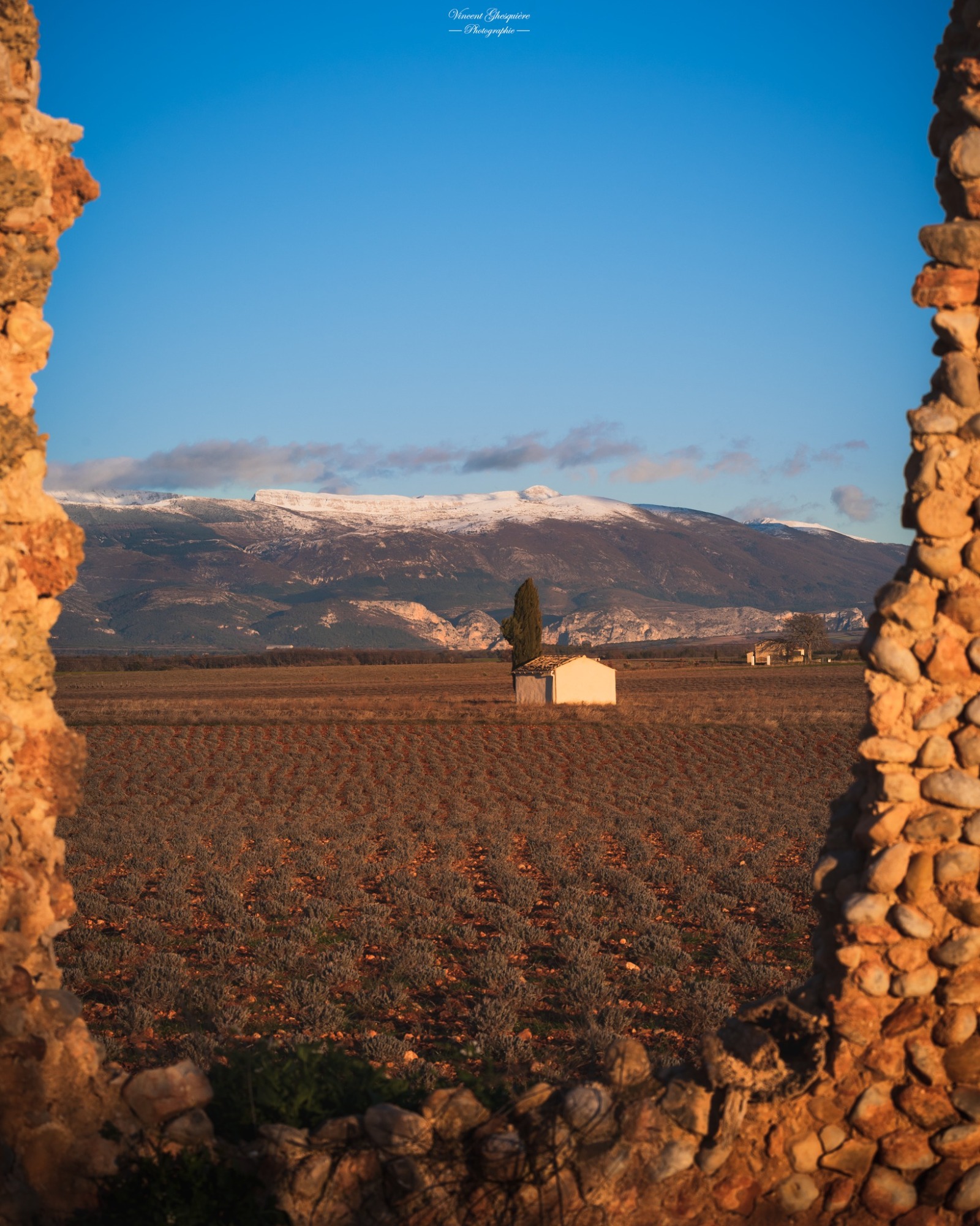 À travers la pierre ouverte, la lavande endormie s’étend sous l’hiver, immobile et silencieuse. Plateau de Valensole, 19 décembre 2022.