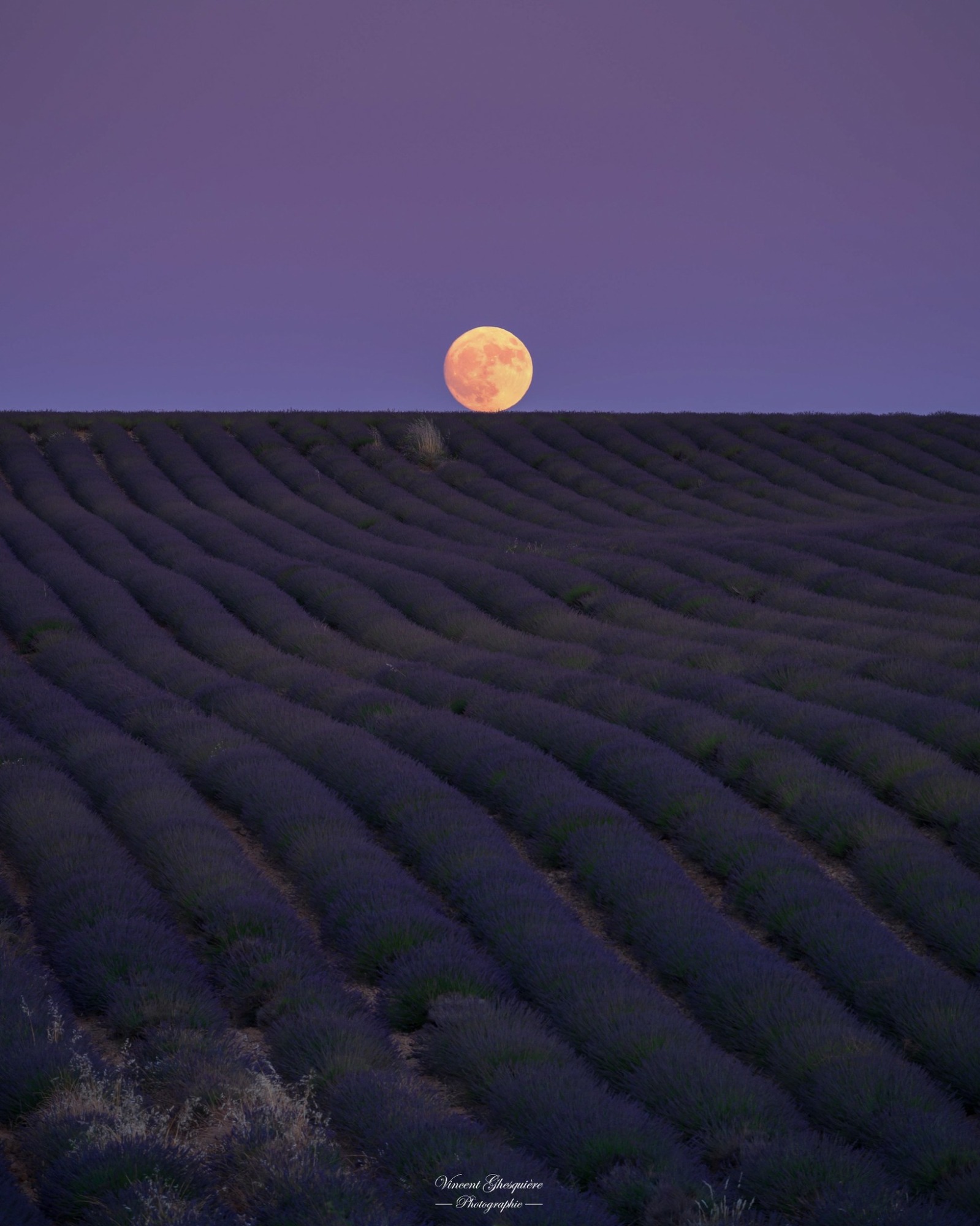 La lune est retenue par la lavande, prête à rouler dans la nuit. Plateau de Valensole, 12 juillet 2025.
