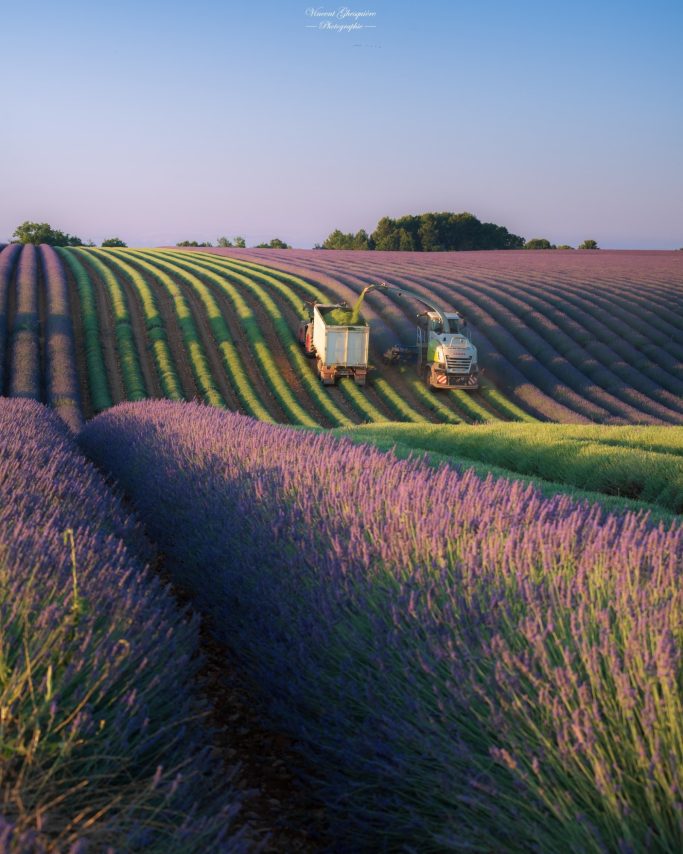La récolte trace sa voie, entre la lavande verte et les rangées encore pleines, suspendues en deux temps Plateau de Valensole, 27 juin 2025.