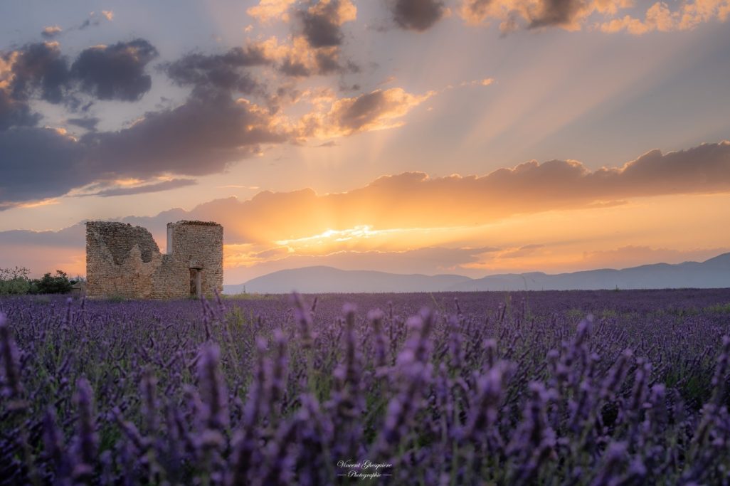 La lavande s’impose, précise et vivante, tandis que la ruine s’efface et que le ciel la sublime. Plateau de Valensole, 30 juin 2025.