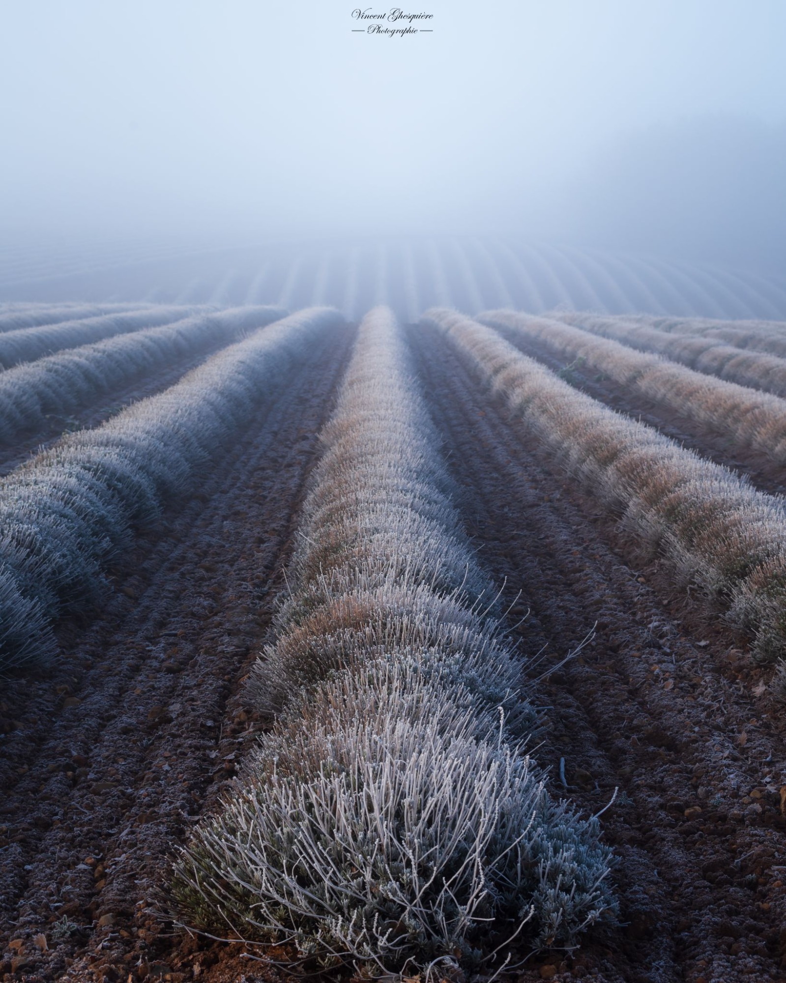 Un voile de givre se pose sur la lavande, révélant un paysage suspendu entre froid et douceur. Plateau de Valensole, 23 novembre 2025.